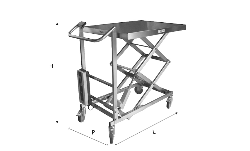 - Structure et plateau porte-charge en acier inoxydable AISI 304 L, finition microbillée.